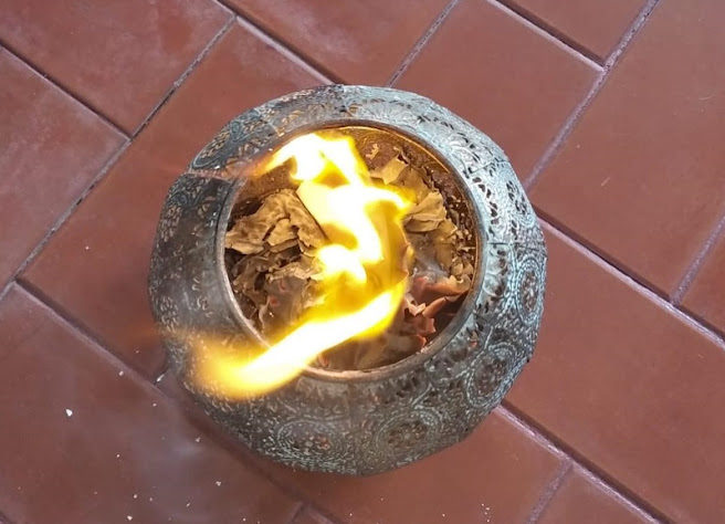 Cada planta o resina tiene un proceso diferente de incendio, muchas se pueden quemar directamente con un encendedor o vela y también sostener directamente -como el Palo Santo, la Salvia o cualquier incienso. Cuando es un sahumerio de resina o una mezcla triturada o en polvo se requiere un carbón (yo siempre recomiendo el vegetal), aceite, ocote o cualquier tipo de iniciador de fuego.